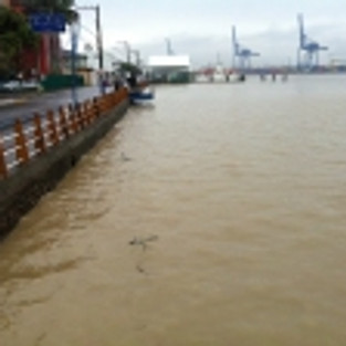 Passamos agora, às 0h35 na beira rio ao lado do ferry boat no centro de Itajaí e faltavam 30 centímetros para a maré subir até o limite da rua. No final, perto da fábrica de gelo, a maré já estava no mesmo nível do pequeno mirante conforme as fotografias abaixo: